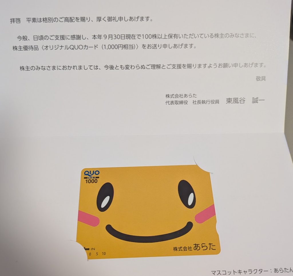 あらたんというかわいいマスコットキャラクターのクオカードが年2回もらえます!