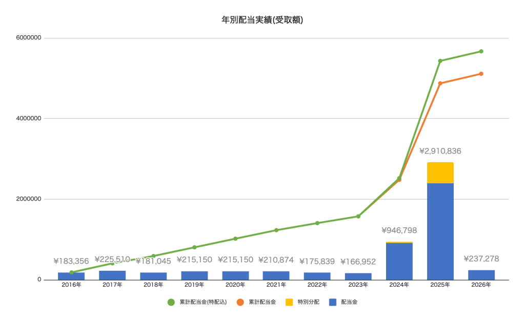 | 年 | 配当金 | 累積配当金 | 前年比 | 特別分配 | 配当金 (特配込) | 累計配当金 (特配込) |