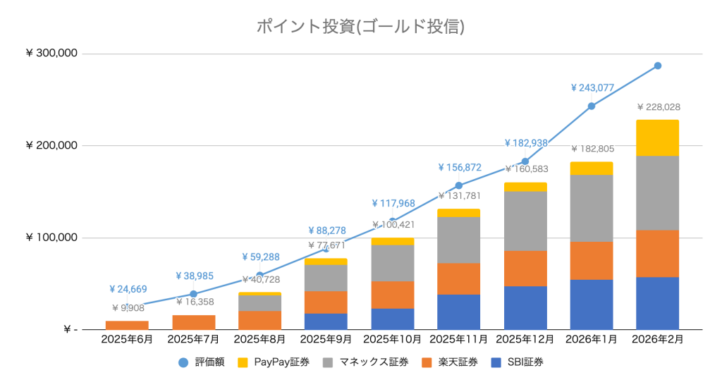 2月は、ゴールドが上がらなかったで、資産増がポイント投資額とほぼ同じでした。